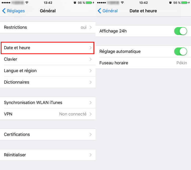 - Allez dans Réglages > Général > Date et heure > Réglage automatique.